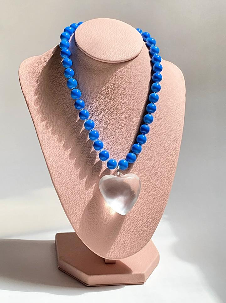 - Collar llamativo, con un colgante de corazón transparente y perlas azules.